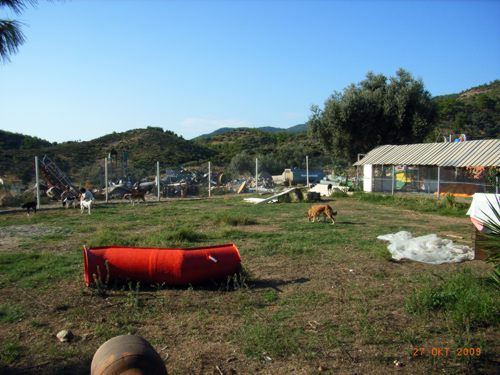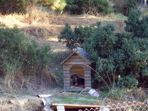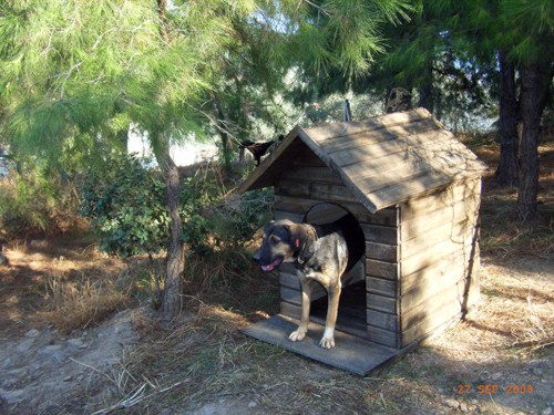 September - Dezember 09: Wir haben Ende September fünf Hundehütten geliefert bekommen, die uns Atilla Sönmez, der Vorsitzende von "Vehist e.V.", als Sachspende geschenkt hat. Nachdem ich die Dächer gegen Regen abgedichtet und den Innenraum mit altem Teppichboden ausgeschlagen habe, wurden sie im Freigehege verteilt. Dort stehen nun insgesamt acht Hütten, die den Hunden bei Unwetter ausreichend Schutz bieten.